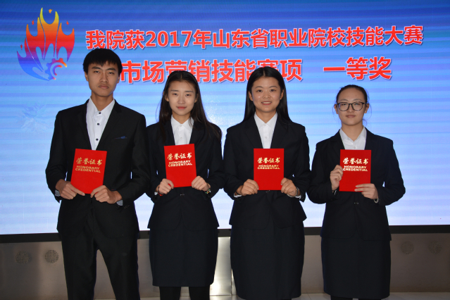 本网讯 (工商管理学院 潘华南) 11月15-16日,山东省职业院校技能大赛“市场营销技能赛项”在山东商业职业技术学院举行。我院由工商管理学院于永辉、李灵君、刘靖、任嘉慧四位选手组成的代表队以96分的总成绩荣获该赛项团体一等奖,牛俊杰、王萍老师荣获优秀指导教师。
