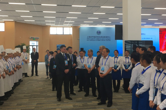 烹饪学院四位老师,特别抽调服务上合宴会服务。其中王桂云、王珊珊、姚金侠三位老师直接参与峰会各国元首6月9日青岛国际会议中心宴会厅欢迎晚宴的烹饪,邢文君老师指导和负责鲁商凯悦酒店峰会宴席接待中西面点出品。