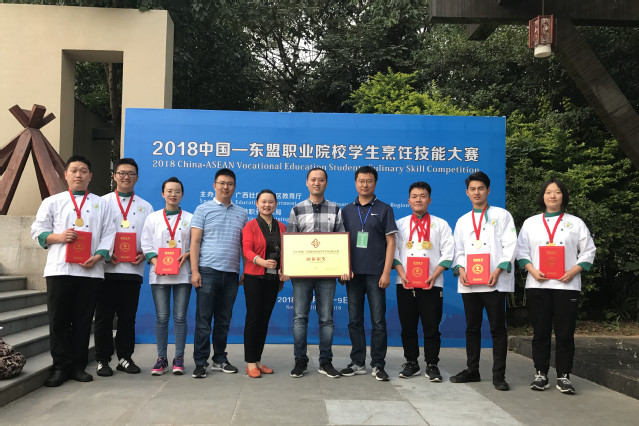 本网讯(烹饪学院 庞阳)11月7日-11月9日,2018年中国-东盟职业院校学生烹饪技能大赛在南宁职业技术学院隆重举行,来自中国与东盟国家十五所院校的近百名烹饪青年才俊齐聚南宁,展开激烈角逐。我院参赛队参加了大赛全部三个赛项,最终发挥出色,技压群雄,勇夺西餐冷菜金牌,并以总分第二的成绩夺得团体银牌。