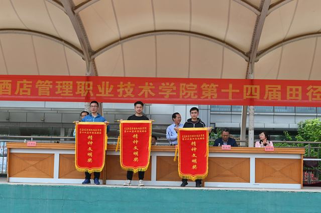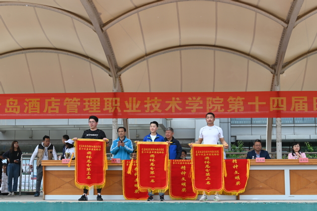 闭幕式上,运动会总裁判长夏飞宣布了竞赛团体总分成绩,工商管理学院、旅游与酒店管理学院、酒店工程学院获得学生组团体总分前三名,基础思政部、行政二队、旅游与酒店管理学院获得教工组团体总分前三名;于敏宣布了获得精神文明奖的单位名单,旅游与酒店管理学院、信息工程技术学院、酒店工程学院获得学生组精神文明奖,酒店工程学院、艺术学院获得教工组精神文明奖。学院领导向获得运动会竞赛团体总分前三名和精神文明奖的单位颁发了锦旗。