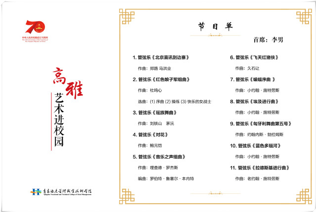 本场音乐会分为红色乐章、电影原声和世界名曲三个部分,演奏了《北京喜讯到边塞》《红色娘子军组曲》《瑶族舞曲》《对花》《音乐之声组曲》《飞天红猪侠》《蝙蝠序曲》《埃及进行曲》《匈牙利舞曲第五号》《蓝色多瑙河》《拉德斯基进行曲》等11个经典曲目,引起了师生的强烈共鸣,学院师生由衷赞叹,这真是一场高水准的视听盛宴。