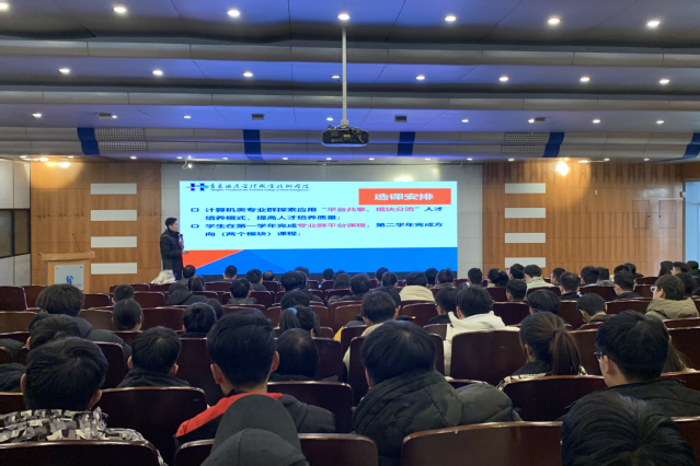 本网讯(信息工程技术学院 于晅)近日,信息工程技术学院在学术报告厅举行2019级计算机类专业群学分制试点选课说明会。信息工程技术学院院长孙丕波,专业群各授课教师和2019级计算机类专业群全体学生参加说明会。说明信息工程技术学院办公室主任涂振主持。