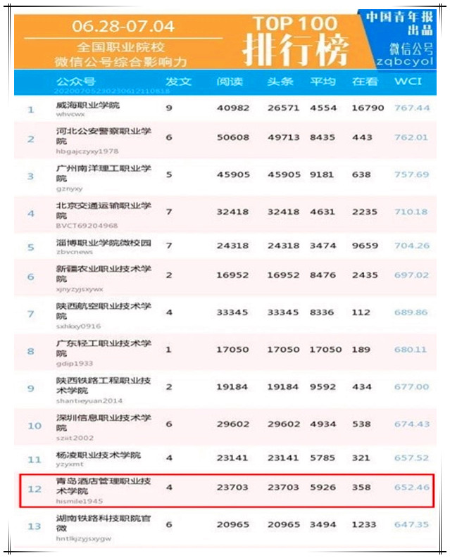 本网讯(宣传统战部 李代玉)7月6日,在中国青年报出品的《全国普通高校微信公号排行榜[6.28-7.4]》中,学院官方微信公众号“sunbet申搏官方网站(hismile1945)”综合影响力位列全国职业院校第十二位,四篇推文全部进入全国职业院校单周文章阅读量top100排行榜。
