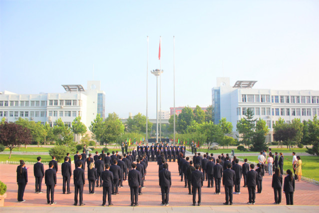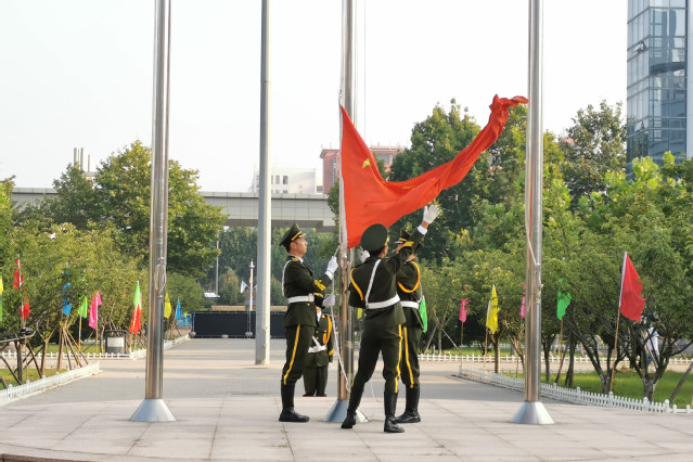 上午七点一刻,迎着朝阳,烹饪学院师生整齐列队,表情肃穆,国旗护卫队队员迈着铿锵有力的步伐,护送国旗前进,雄壮的国歌唱响在酒管校园,鲜艳的五星红旗在师生注目礼中冉冉升起,迎风飘扬。