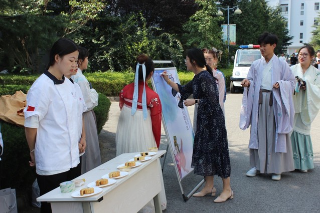 9月24日中午,同学们身着传统汉服,用新时代的精神风貌展示着中华传统服装的韵律与大美。烹饪学院的师生发挥专业优势,为同学们准备了各式各样的中秋月饼,让异乡求学的学子们感受到了学院浓浓的关怀,也感受到了中华传统美食的魅力。