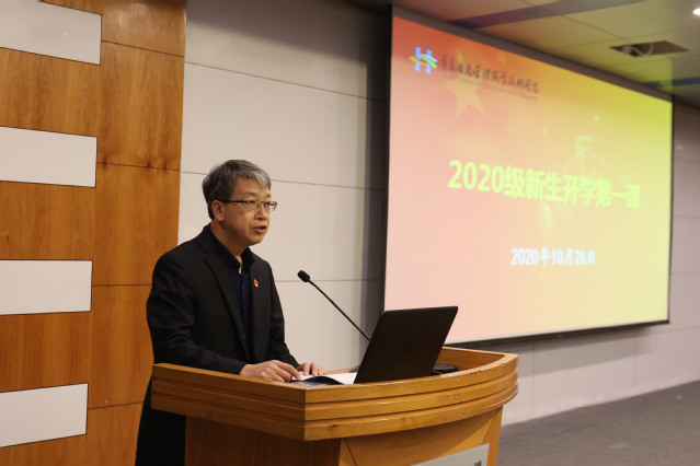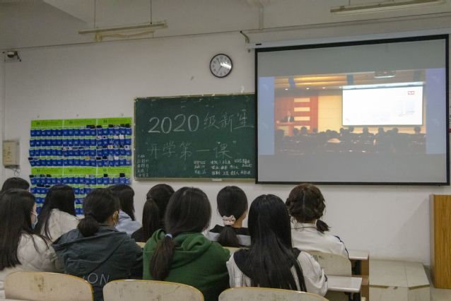 本网讯(宣传统战部 于克晓)10月26日是2020级新生正式开课第一天,学院党委书记李达走进课堂,以《在矢志奋斗中谱写新时代的青春之歌》为题,为2020级新生讲授开学第一课。新生代表、各二级学院党总支书记、学工办主任、辅导员和班主任代表、相关职能部门负责人在学术报告厅主会场听讲,2020级其他新生、教职员工、学生家长和其他年级在校生同步收看网络直播。