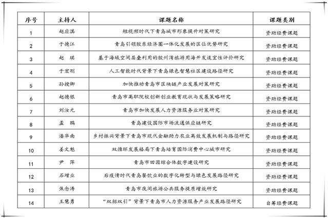 据悉,本次青岛市“双百调研工程”共计立项课题80项,立项数在所有申报单位中排名第一。学院具体课题立项名单如下: