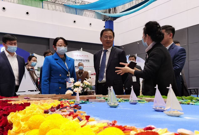 承接布展工作以来,学院领导高度重视,召开专题会议研究布展方案,并由教务处和党委宣传统战部负责,发挥学院双高专业群技能技艺优势,艺术学院院长朱广丽牵头组建“技能技艺主题成果展示”创意设计团队,艺术学院、烹饪学院、酒店管理学院、文旅学院选派李曦、周海燕、于海龙、王潇洁、王珊珊、邢文君、张桂凤、姚金侠、周海磊、周林、刘宁、吕娟等骨干教师和优秀学生,配合完成主题展示创作和技能展示。学院承展的山东职业教育展区休闲互动区分为技能技艺成果展示区、休闲区、互动区三个功能区,技能技艺成果展示区“千帆竞发”展台是我院融衍纸、面塑、插花、环艺设计等技能技艺为一体的成果展示平台,互动区包括衍纸、茶艺、咖啡、面点制作等技能技艺的现场演示互动。