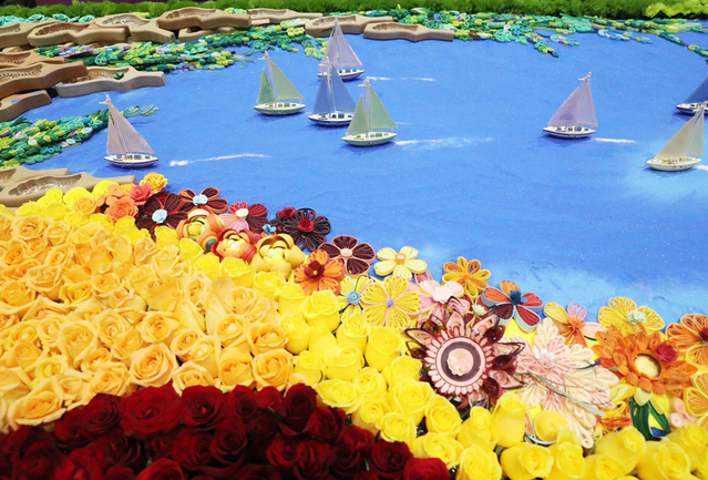 “千帆竞发”展台寓意部省共建职业教育创新发展高地工作蓄势起航,象征学院推进“双高计划”建设、实现高质量发展风帆正举。学院山东省中华优秀传统文化传承基地非物质文化遗产饽饽榼子构成“大树”“游鱼”的视觉形象,“大树”象征“立德树人、教书育人”的教育理念;“游鱼”意味着莘莘学子力争上游的精神;用衍纸花、面花和艺术插花代表学院各专业融合之美,寓意“百花齐放,专业融合”;“浪花”与“帆船”寓意乘风破浪、勇往直前的精神;孔雀是才华和品德的象征,体现了学院德育为先、知行合一的育人理念。