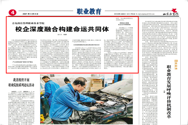 本网讯(党委宣传统战部 于克晓)3月8日,《山东教育报》第四版以《校企深度融合 构建命运共同体》为题,报道学院校企融合工作,全文如下:
