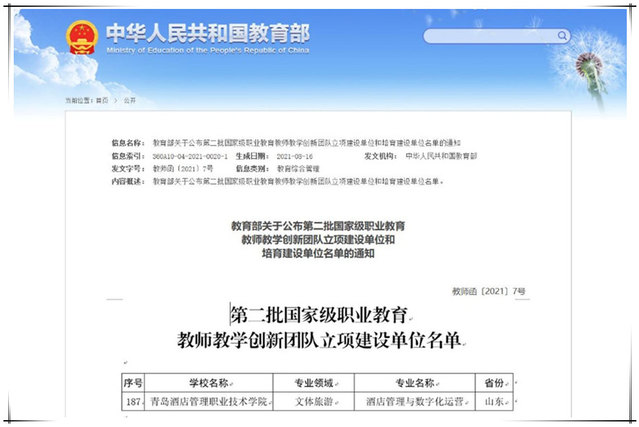 8月9日,教育部印发《关于公布第二批国家级职业教育教师教学创新团队立项建设单位和培育建设单位名单的通知》(教师函〔2021〕7号),酒店管理与数字化运营专业教学团队入选教育部教师教学创新团队。