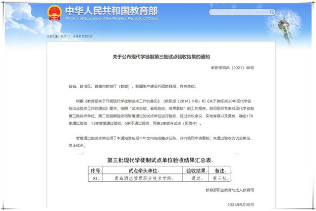 9月30日,教育部职成司印发《关于公布现代学徒制第三批试点验收结果的通知》(教职成司函〔2021〕40号),学院以酒店管理、旅游管理、会展策划与管理、烹调工艺与营养四个专业为依托,联合山东银座旅游集团和北辰会展集团开展的现代学徒制试点项目通过教育部验收。