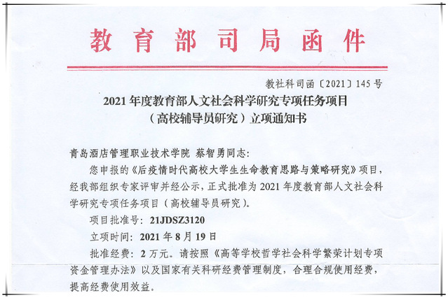 张宗国副院长主持的《对接职业标准构建酒店管理与数字化运营专业群课程体系的研究与实践》被立项为国家级职教团队课题研究项目专业领域课题,蔡智勇副教授主持的《后疫情时代高校大学生生命教育思路与策略研究》被立项为2021年度教育部人文社会科学研究一般项目高校辅导员研究专项课题,填补了学院国家级课题的空白。