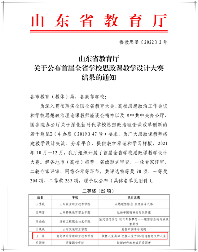 本网讯(马克思主义学院 王萍)日前,山东省教育厅公布了首届全省学校思政课教学设计大赛获奖名单,马克思主义学院王萍老师《领悟人生真谛 把握人生方向——创造有意义的人生》荣获高职高专组“思想道德与法治”参赛作品二等奖。