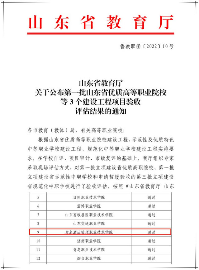 本网讯(教务处 白友强)近日,山东省教育厅发布了《关于公布第一批山东省优质高等职业院校等3个建设工程项目验收评估结果的通知》,学院通过优质高等职业院校验收。