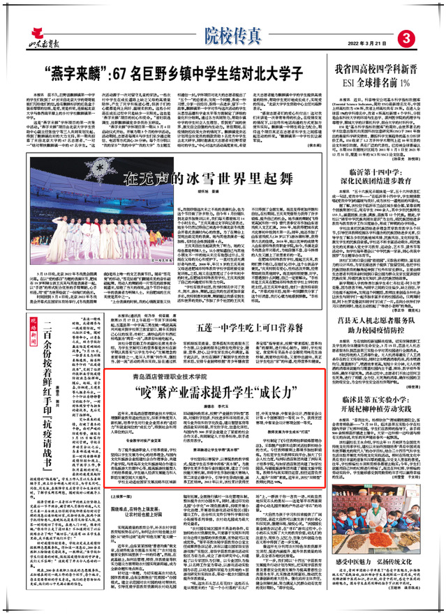 本网讯(党委宣传统战部)3月21日,《山东教育报》第三版以《sunbet申搏官方网站“咬”紧产业需求提升学生“成长力”》为题,报道学校增强职业教育适应性,探索多维度育人新机制,培养学生“适切力”和“成长力”的经验做法。全文如下: