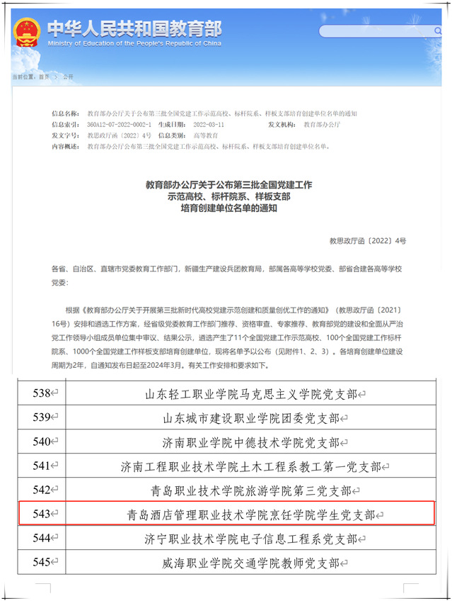 本网讯(组织人事处 烹饪学院)近日,教育部公布了第三批新时代高校党建示范创建和质量创优工作遴选结果,烹饪学院学生党支部入选“全国党建工作样板支部”培育创建名单。