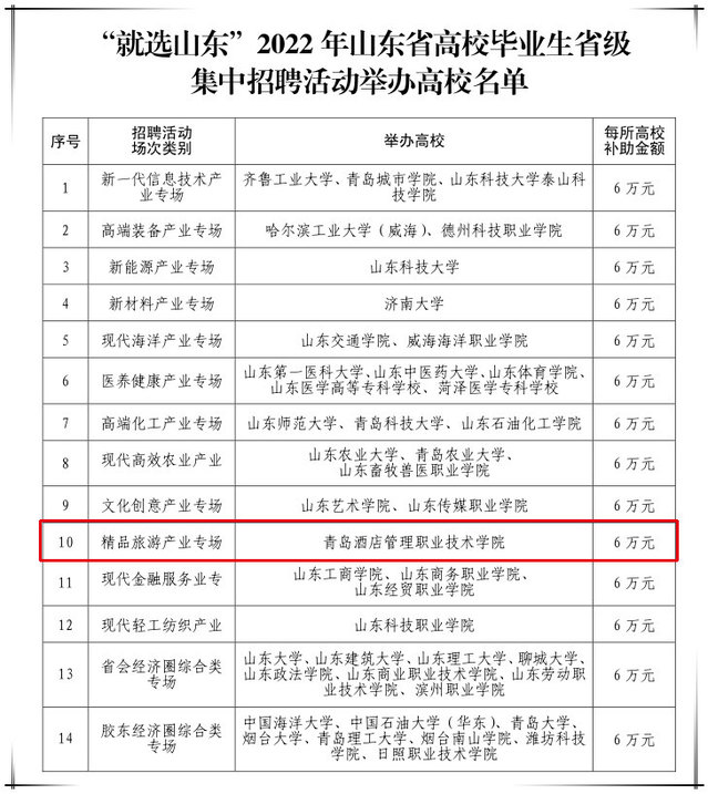 本网讯(招生就业办公室 刘卿文)近日,山东省人力资源和社会保障厅发布了“就选山东”2022年山东省高校毕业生校园招聘系列活动通知,sunbet入选2022年省级集中招聘活动举办高校,也是举办“精品旅游产业专场”的唯一院校,并获得补助资金6万元。