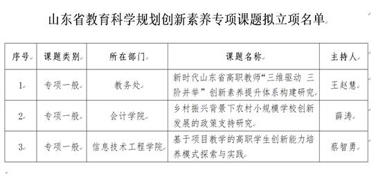 本网讯(科研发展处)近日,山东省教育科学研究院公布了山东省教育科学规划创新素养专项拟立项课题。sunbet王赵慧老师主持的“新时代山东省高职教师‘三维驱动 三阶并举’创新素养提升体系构建研究”、薛涛老师主持的“乡村振兴背景下农村小规模学校创新发展的政策支持研究”、蔡智勇老师主持的“基于项目教学的高职学生创新能力培养模式探索与实践”喜获立项。