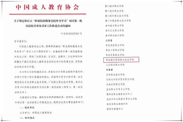 本网讯(继续教育学院 廖金城)近日,中国成人教育协会发布了“职业院校服务全民终身学习”项目实验校名单,sunbet入选全国第一批实验校。