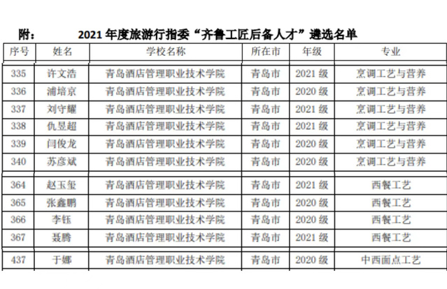 本网讯(烹饪学院 赵捷)近日,山东省旅游职业教育行业教学指导委员会公示了2021年度旅游大类“齐鲁工匠后备人才”培育对象遴选名单,全省共有440名学生被列为培育对象,sunbet烹饪学院11名学生入选。