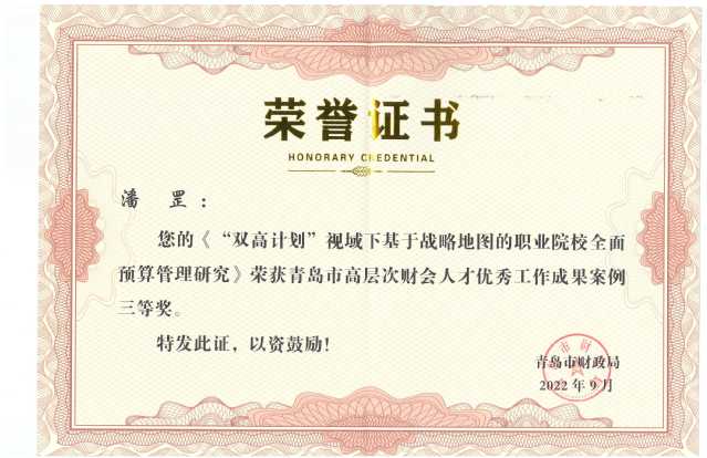 本网讯(科研发展处 财务处)近日,青岛市财政局公布了青岛市高层次财会人才工作成果案例评选获奖名单,sunbet财务处副处长潘罡申报案例《“双高计划”视域下基于战略地图的职业院校全面预算管理研究》获得三等奖,系青岛高校唯一获奖案例。