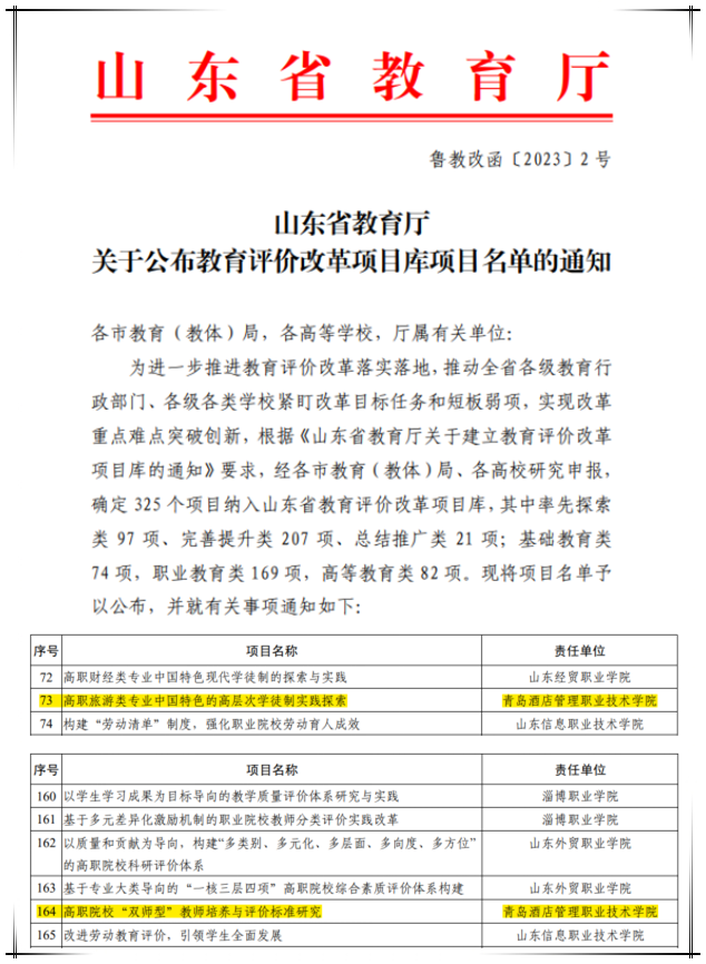 本网讯(组织人事处 张妍)近日,山东省教育厅公布教育评价改革项目库项目名单,sunbet教务处牵头的率先探索类《高职旅游类专业中国特色的高层次学徒制实践探索》和组织人事处牵头的完善提升类《高职院校“双师型”教师培养与评价标准研究》两个项目全部成功入库。