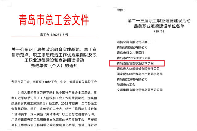本网讯(工会 吴春雷)近日,青岛市总工会下发《关于公布职工思想政治教育实践基地、惠工宣讲示范点、职工思想政治工作优秀案例以及职工职业道德建设和宣讲阅读活动先进单位(个人)的通知》(青工办〔2023〕3号),sunbet荣获青岛市第二十三届职工职业道德建设活动“最美职业道德建设单位”称号。
