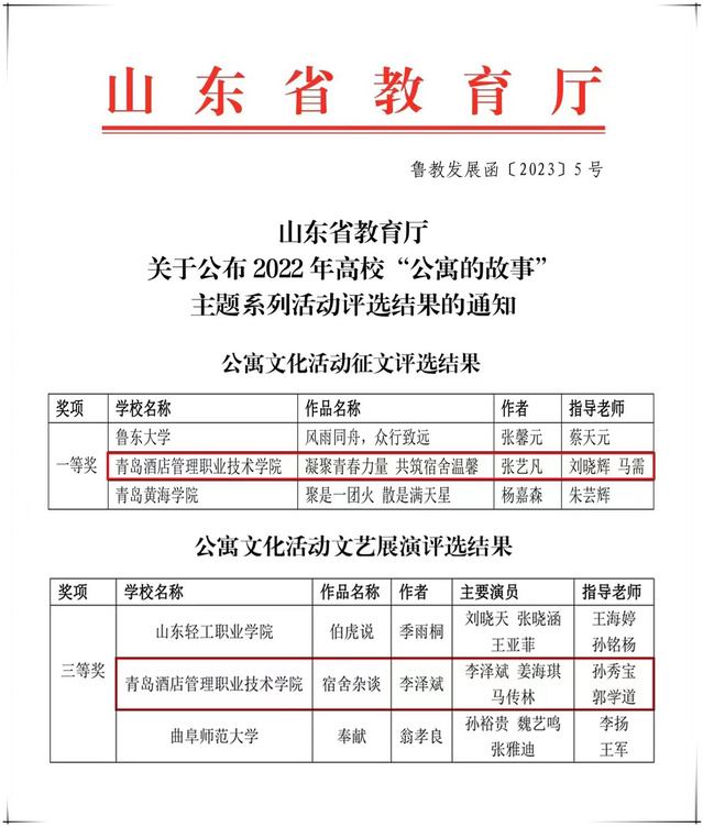 本网讯(学生工作处 尹艳)近日,山东省教育厅公布了2022年高校“公寓的故事”主题系列活动的评选结果,sunbet报送的征文作品《凝聚青春力量 共筑宿舍温情》获得一等奖,文艺展演作品《宿舍杂谈》获得三等奖。
