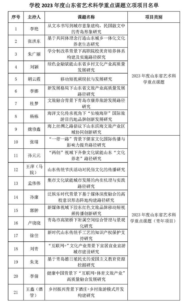 本网讯(科研发展处 魏有广)近日,山东省艺术科学重点课题评审办公室公布了2023年度山东省艺术科学重点课题立项项目名单,sunbet成功立项21项。其中,立项重点课题9项、重点课题(青年项目)12项。