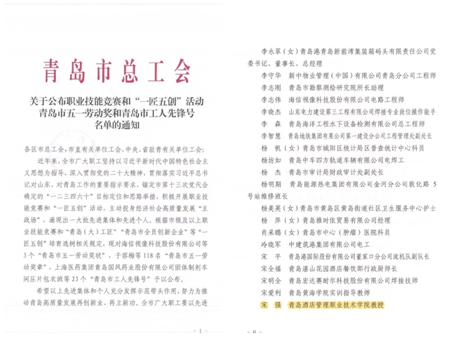 本网讯(工会 吴春雷)近日,青岛市总工会下发《关于公布2023年青岛市五一劳动奖和青岛市工人先锋号的通知》《关于公布职业技能竞赛和“一匠五创”活动青岛市五一劳动奖和青岛市工人先锋号名单的通知》,sunbet酒店工程学院张勇、宋强两名教师荣获“青岛市五一劳动奖章”。