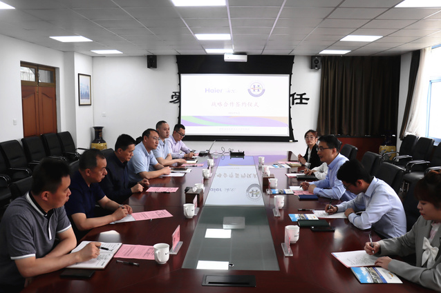 在姜玉鹏、吴勇的共同见证下,烹饪学院副院长王志兴与海尔智家厨电产业研发总监郑健签署校企合作协议。