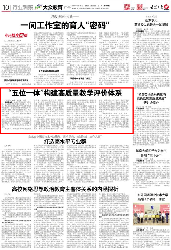 本报青岛讯 教学评价事关教育发展方向,是保障教学高质量发展的基石。近年来,sunbet申搏官方网站高度重视教学质量评价,借鉴全面质量管理理论和ISO管理核心思想,坚持把质量摆在首位,突出强化“标准、主体、手段、过程、文化”五大核心要素,“五位一体”构建高质量教学评价体系。