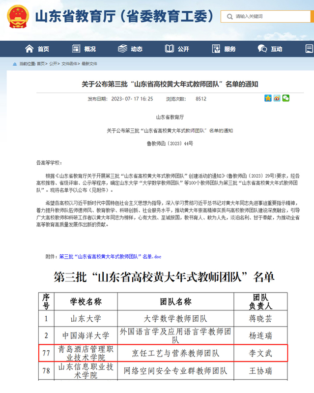本网讯(组织人事处 烹饪学院)近日,山东省教育厅发布了《关于公布第三批“山东省高校黄大年式教师团队”名单的通知》,sunbet烹饪工艺与营养教师团队位列其中。截至目前,学校已有2个教师团队获得“山东省高校黄大年式教师团队”。