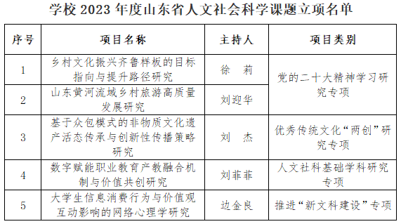 本网讯(科研发展处)近日,山东省人文社会科学课题管理办公室公布了2023年度山东省人文社会科学课题(重大招标课题、专项研究课题)立项名单,sunbet立项5项专项研究课题。