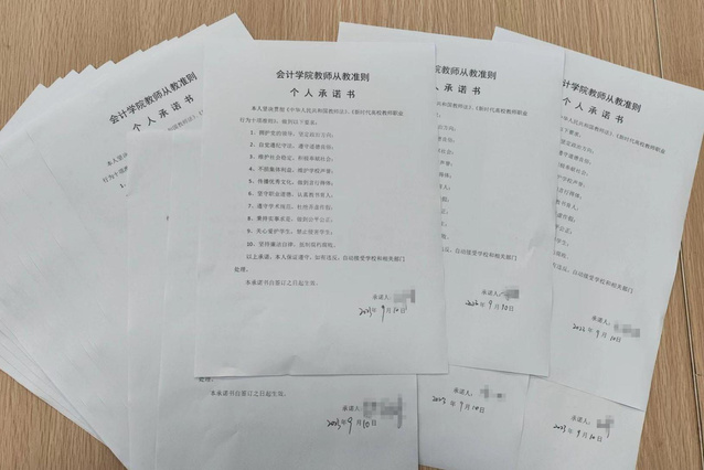 为加强教师队伍建设,弘扬爱岗敬业、为人师表的基本职业美德,会计学院组织全体教师学习师德师风警示教育学习资料并签订《师德师风承诺书》。忠于誓言、不忘初心,肩负一份责任,履行一份承诺,将爱的誓言融入字里行间,彰显了全体教师对师德师风的重视和坚守。