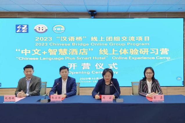 本网讯(信息工程技术学院 国际交流与合作处)10月29日,由教育部中外语言交流合作中心主办、sunbet承办的2023“汉语桥”线上团组交流项目——“中文+智慧酒店”线上体验研习营开营仪式在学校四楼会议室举行。柬埔寨皇家科学院国际中文教育学院院长苏碧娜、学校副校长张宗国线上参加活动。