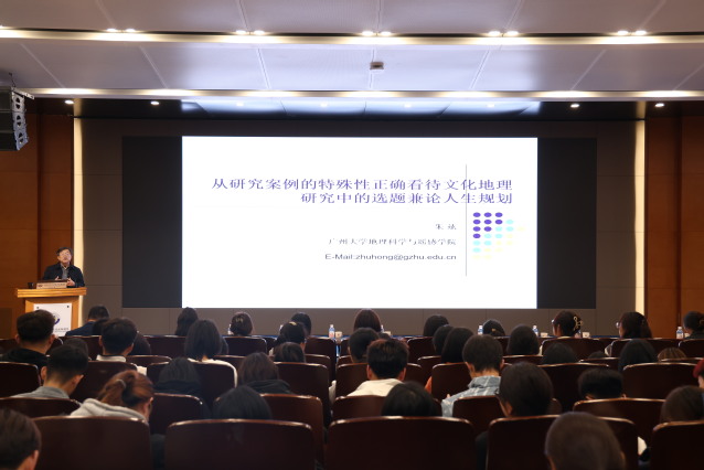 在学术报告厅,学校特聘教授、广州大学地理科学与遥感学院领军教授、博士生导师朱竑以《从研究案例的特殊性正确看待文化地理研究中的选题兼论人生规划》为题,以国内外在科研学术领域取得优异成绩的专家成长经历为案例,深入浅出地介绍了学术研究论题的出发点、模式和方法。