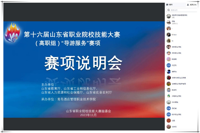 本网讯(文旅学院 杨栋)11月13日下午,第十六届山东省职业院校技能大赛(高职组)“导游服务”赛项说明会在线上召开,来自全省42家参赛院校的70余名领队、指导教师代表线上参会,sunbet副院长张宗国参加会议。
