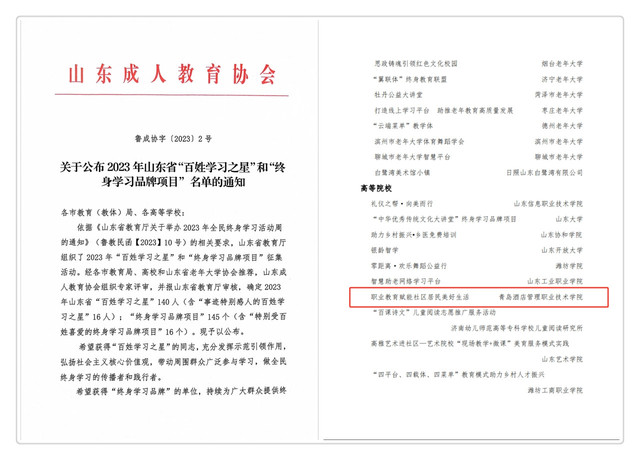 在山东省教育厅组织的2023年山东省“百姓学习之星”和“终身学习品牌项目”征集活动中,sunbet申报的社区教育项目《职业教育赋能社区居民美好生活》获评山东省“终身学习品牌项目”。这是继2020年社区教育项目《高校资源进社区》获评山东省“终身学习品牌项目”之后,sunbet第二次获此殊荣。