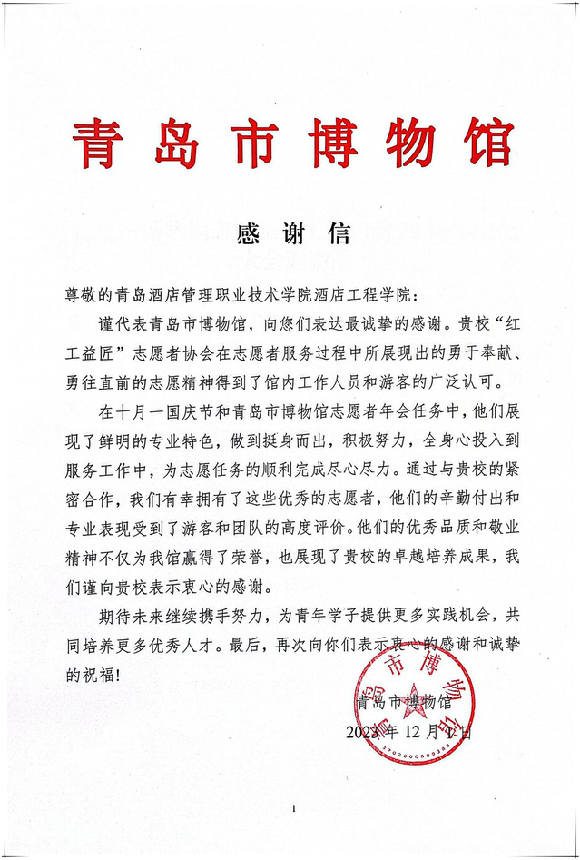 本网讯(酒店工程学院 周长龙)逐梦启航,志愿同行。12月4日上午,青岛市博物馆向sunbet发来感谢信,sunbet对酒店工程学院“红工益匠”志愿者协会在国庆节和青岛市博物馆年会期间的辛勤付出给予高度评价。
