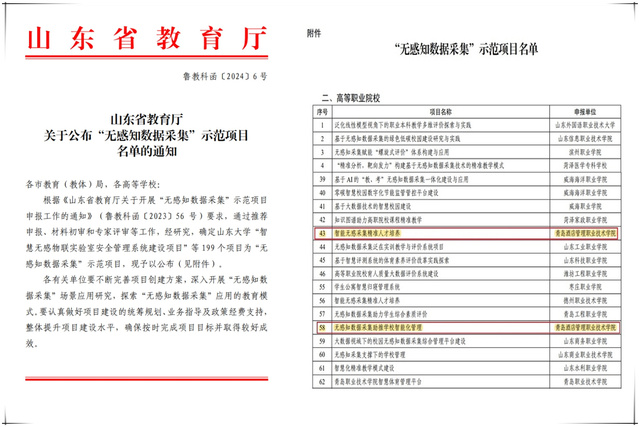 本次项目申报是山东省大力推动教育数字化应用新场景、新模式,积极推动教育理念重塑、学习方式重构、业务流程再造以及促进教育数字化转型的重要举措,全省共入选199个项目,其中,高等职业院校75个。学校为做好项目申报工作,面向全校开展了项目征集工作,教育信息中心、教务处等部门共同组织遴选,推荐“精准教学”“学校管理”两个方向的项目,全部成功入选。