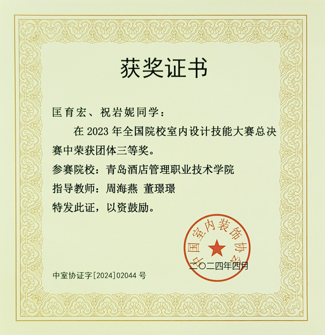 本网讯(艺术学院 周海燕)4月9日-11日,2023年全国院校室内设计技能大赛总决赛举行,sunbet艺术学院环境艺术设计专业匡育宏、祝岩妮两名同学组成的参赛队伍荣获团体三等奖,周海燕、董璟璟老师荣获优秀指导教师。
