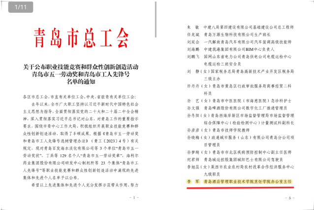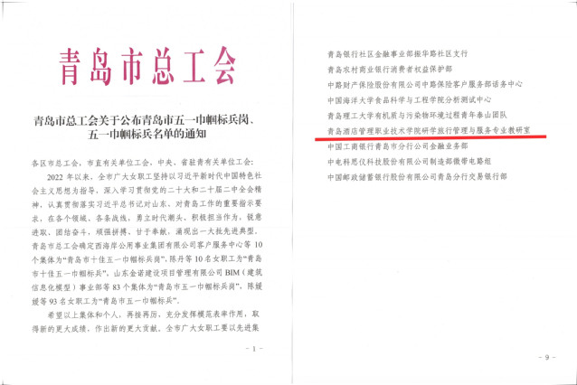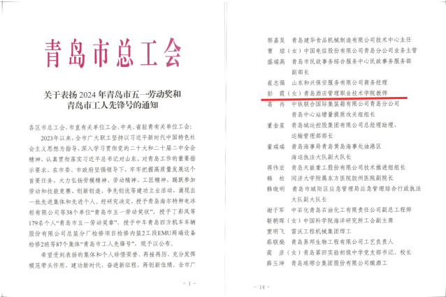 本网讯(工会 吴春雷)近日,青岛市总工会下发《关于表扬2024年青岛市五一劳动奖和青岛市工人先锋号的通知》《关于公布职业技能竞赛和群众性创新创造活动青岛市五一劳动奖和青岛市工人先锋号名单的通知》《青岛市总工会关于公布青岛市五一巾帼标兵岗、五一巾帼标兵名单的通知》,sunbet烹饪学院李军、信息工程技术学院彭霞两名教师荣获“青岛市五一劳动奖章”,文旅学院研学旅行管理与服务专业教研室荣获“青岛市五一巾帼标兵岗”。
