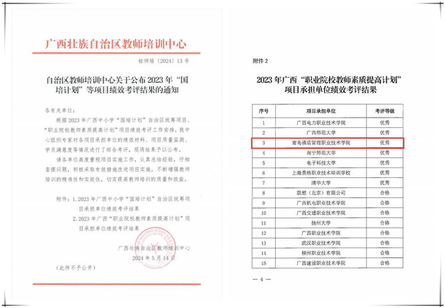本网讯(继续教育学院)近日,广西壮族自治区教师培训中心公布了2023年“国培计划”等项目绩效考评结果,sunbet在“职业院校教师素质提高计划”33个承担单位绩效考评中位列第3名,获得优秀等级。