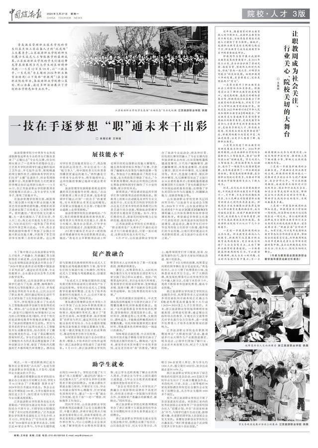 sunbet申搏官方网站的学生们在烹饪工匠后备人才的“比武场”上大展身手,山东旅游职业学院的师生们展示生成式人工智能教学的最新成果,江苏旅游职业学院的学生们通过舞龙等表演展现当代大学生的良好精神风貌……5月12日至18日,以“一技在手,一生无忧”为主题的2024年职业教育活动周(以下简称“职教周”)在全国职业院校举办,各旅游职业学院精心策划、用心准备,通过多种活动展示了学校的办学特色和专业水平。