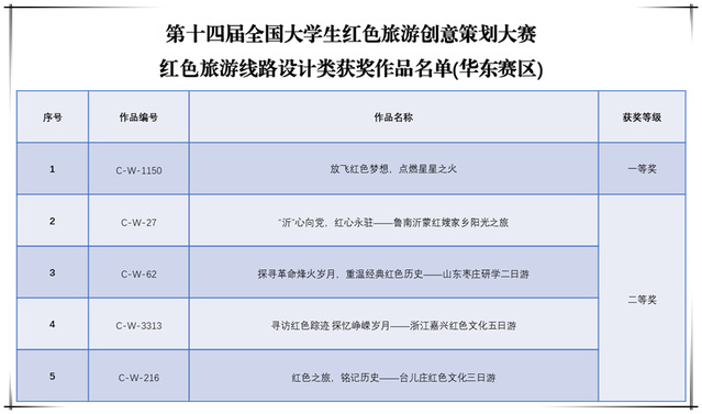 本网讯(文旅学院 田超)近日,第十四届全国大学生红色旅游创意策划大赛成绩揭晓,sunbet文旅学院学子作品荣获华东赛区红色旅游线路设计赛道一等奖1项、二等奖4项。