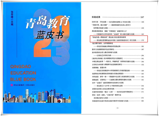 本网讯(继续教育学院 教务处 科研发展处)近日,《青岛教育蓝皮书(2023年)》出版发行,sunbet继续教育学院社区教育实践成果《“校地共建+职继协同”理念助力社区教育结硕果——sunbet申搏官方网站“高校资源进社区”项目实践》入选。