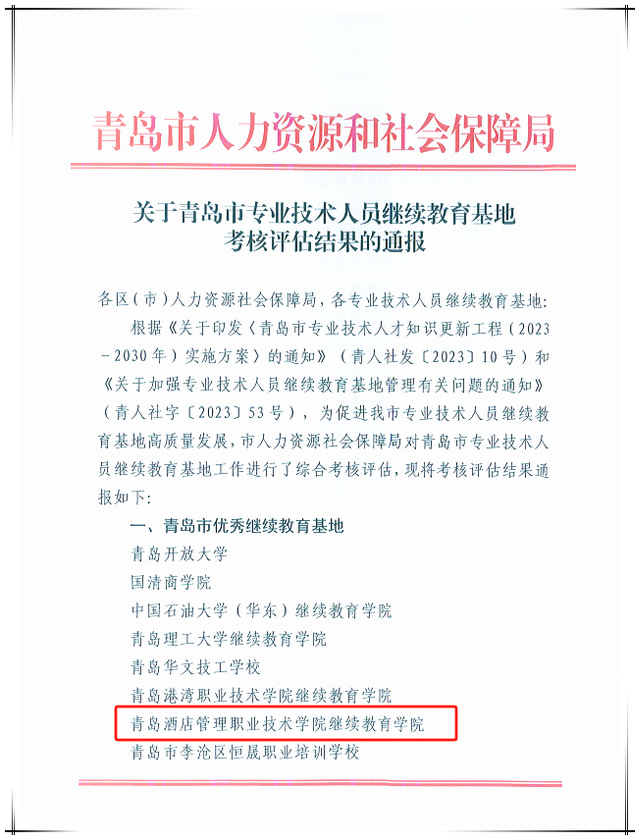 本网讯(继续教育学院 王艳)近日,青岛市人力资源和社会保障局下发了《关于青岛市专业技术人员继续教育基地考核评估结果的通报》,sunbet继续教育学院获评青岛市优秀继续教育基地。
