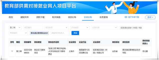 本网讯(酒店管理学院 王志飞)近日,教育部公布第三期供需对接就业育人项目名单,酒店管理学院申报项目《“如家之星”高阶学徒制——大学生就业实习基地建设》入选。